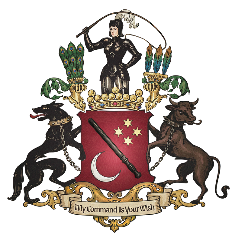 Faithful to tradition yet free from patriarchal constraints, this crest belongs to a Female-led house. At its summit stands an armoured Dominatrix in command of the world I inhabit and uphold: a world of Female superiority, authority, command and protection.